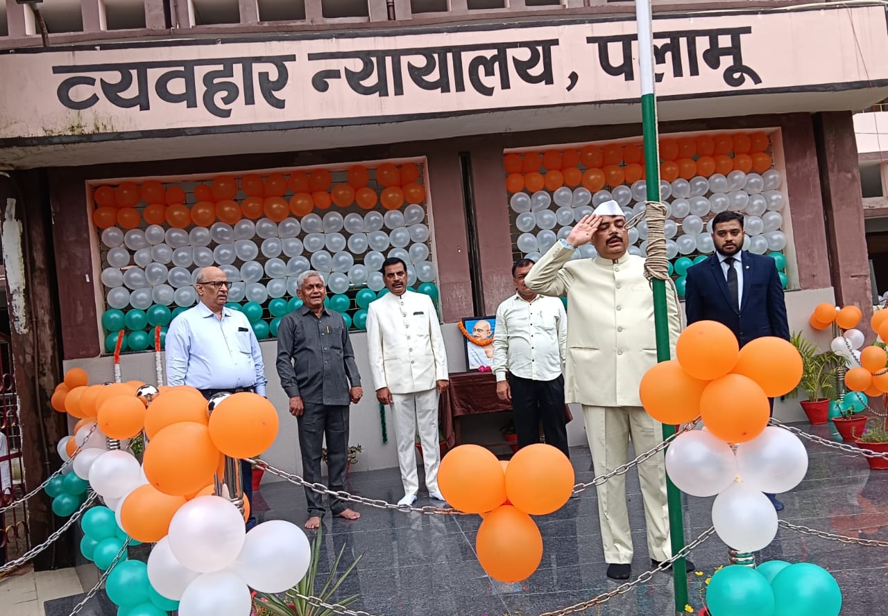 78 वें स्वतंत्रता दिवस के अवसर पर 15 अगस्त 2024 को पलामू ब्यवहार न्यायालय परिसर में पलामू के प्रधान जिला व सत्र न्यायाधीश नीरज कुमार श्रीवास्तव ने ध्वजारोहण किया।इसके पूर्ब प्रधान जिला व सत्र न्यायाधीश नीरज कुमार श्रीवास्तव ने राष्टपिता महात्मा गांधी के चित्र पर पुष्पांजलि अर्पित किया।इस मौके पर कमल पुष्प बाटिका को आकर्षक ढंग से सजाया गया था। ध्वजारोहण कार्यक्रम के मौके पर कुटुंब न्यायालय के प्रधान न्यायाधीश मार्तण्ड प्रताप मिश्रा,डीजे बिनोद कुमार सिंह,अभिमन्यु कुमार, अखिलेश कुमार, राज कुमार मिश्रा, स्वेता ढिंगरा,आयशा खान,शंकर महाराज, सिविल जज सीनियर डिवीजन संजय सिंह यादव,सीजेएम आनंद सिंह, एसीजेएम संदीप निशित बारा, निशिकांत, शिखा अग्रवाल,परमानंद उपाध्याय,डालसा सचिव अर्पित श्रीवास्तव,एस डी जे एम कमल प्रकाश,रीतू कुजूर, रेलवे जे एम प्रज्ञेश निगम,जे एम रश्मि चन्देल, समीरा खान ,अमित प्रकाश सिन्हा, लीगल एड डिफेन्स काउंसिल के चीफ अमिताभ चंद सिंह, डिप्टी चीफ संतोष कुमार पांडेय,अधिवक्ता संघ के अध्यक्ष रामदेव प्रसाद यादव,महासचिव अजय कुमार पांडेय, उपाध्यक्ष विनोद कुमार तिवारी,कोषाध्यक्ष जय किशोर पाठक,जी पी अखिलेश्वर प्रसाद, बरीय अधिवक्ता अखिलेश चन्द सिंह, संतोष कुमार दुबे,राजेश्वर पांडेय,के अलावे ब्यवहार न्यायालय के कर्मी ,सुरक्षा कर्मी,आदेशपाल आदि लोग उपस्थित थे।