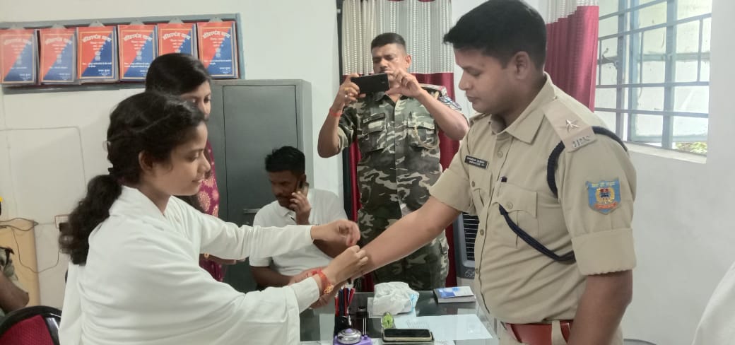 रक्षा बंधन के अवसर पर सोमवार को ब्रह्म कुमारी बहनों ने स्थानीय थाना में पदस्थापित पुलिस पदाधिकारियों को राखी बांधकर मुंह मीठा कराया। इस दौरान बहनों ने पुलिस निरीक्षक सह थाना प्रभारी चंदन कुमार एसआई राकेश कुमार सिंह,बिगेश कुमार राय, रंजीत कुमार सिंह, शशि शेखर पाण्डेय, डीके गोप एएसआई मनोज दास को रक्षा सूत्र बांधा। वहीं थाना प्रभारी चंदन कुमार ने बहनों की सुरक्षा में सदैव तत्पर रहने का विश्वास दिलाया।