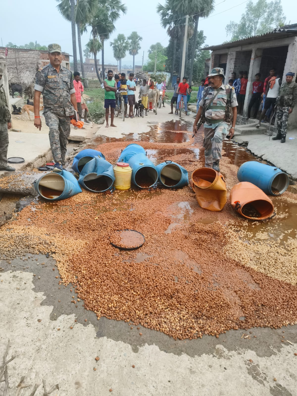हरिहरगंज थाना क्षेत्र के सरसोत गांव में रविवार को पुलिस ने सघन छापेमारी कर बड़ी मात्रा में अवैध महुआ शराब बरामद किया है। इस दौरान 300 किलोग्राम जावा महुआ 40 लीटर निर्मित शराब के साथ ही शराब बनाने के सभी उपकरणों को मौके पर ही विनष्ट कर दिया गया। इस संबंध में पुलिस निरीक्षक सह थाना प्रभारी चंदन कुमार ने बताया कि विधानसभा चुनाव को लेकर तथा पुलिस अधीक्षक पलामू के निर्देशानुसार क्षेत्र में लगातार अवैध रूप से शराब के कारोबार करनेवालों के खिलाफ अभियान चलाया जा रहा है। उन्होंने बताया कि पुलिस इस धंधे में संलिप्त लोगों की पहचान करने में जुटी हुई है। धंधेबाजों के विरुद्ध विधिसम्मत कार्रवाई की जाएगी। छापेमारी अभियान में पथरा ओपी प्रभारी मंटू कुमार सहित सशस्त्र बल शामिल थे।
