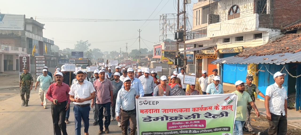 मतदाता जागरुकता अभियान के तहत प्रखंड कार्यालय, चंदवा से डेमोक्रेसी रैली निकाली गई। इस बृहद आयोजन में विभिन्न चौक–चौराहे से होते हुए मतदाताओं को मतदान के प्रति जागरूक करते हुए डेमोक्रेसी रैली का समापन खेल स्टेडियम, चंदवा में किया गया। डेमोक्रेसी रैली में जिला स्तरीय पदाधिकारी, कर्मी, स्कूली छात्र छात्राएं, एनसीसी के कैडेट, इत्यादि की बड़ी संख्या में सहभागिता रही।
