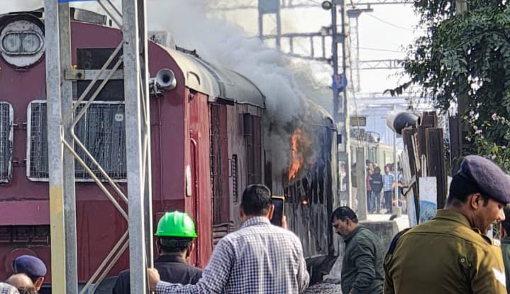 ट्रेन जलकर हुई खाक, ग्रासिम इंडस्ट्रीज का फायर ब्रिगेड टीम दो दमकल के साथ पहुंच बड़ी घटना को रोका