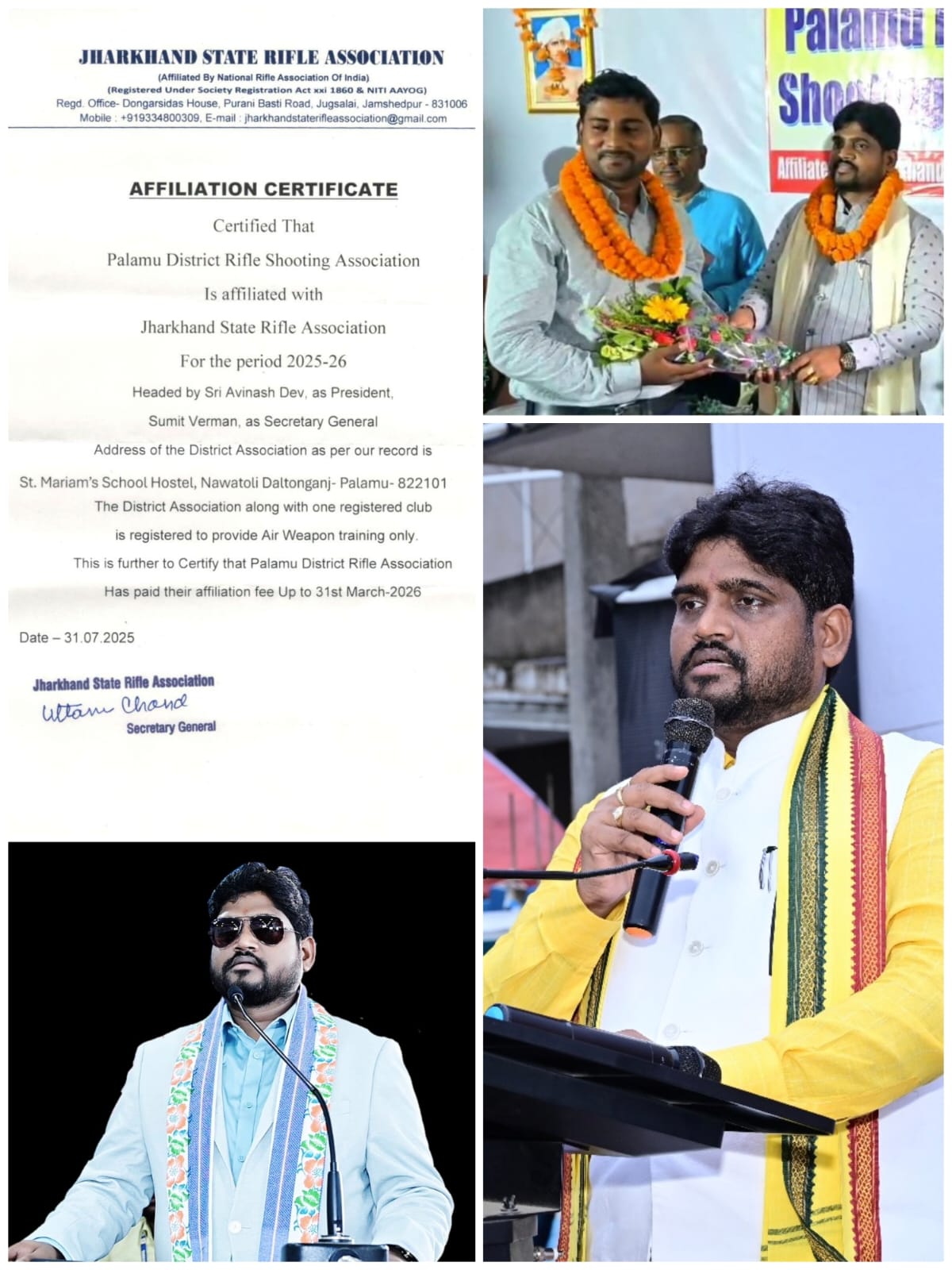 पलामू जिला राइफल शूटिंग एसोसिएशन को झारखंड स्टेट राइफल एसोसिएशन से आधिकारिक मान्यता मिल गई है। 31 जुलाई को जारी अफिलिएशन सर्टिफिकेट के अनुसार, पलामू एसोसिएशन वर्ष 2025-26 के लिए झारखंड राज्य संघ से संबद्ध रहेगा। यह एसोसिएशन अविनाश देव की अध्यक्षता में और सुमित वर्मन के सचिवीय कार्यकाल में संचालित होगा।