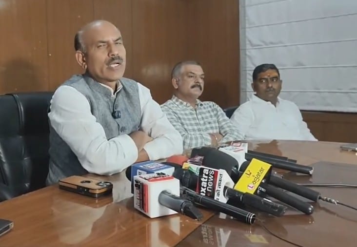 प्रेस कॉन्फ्रेंस में अभय कुमार दुबे, परीक्षित तिवारी तथा बैद्यनाथ पांडेय उपस्थित रहे ।
